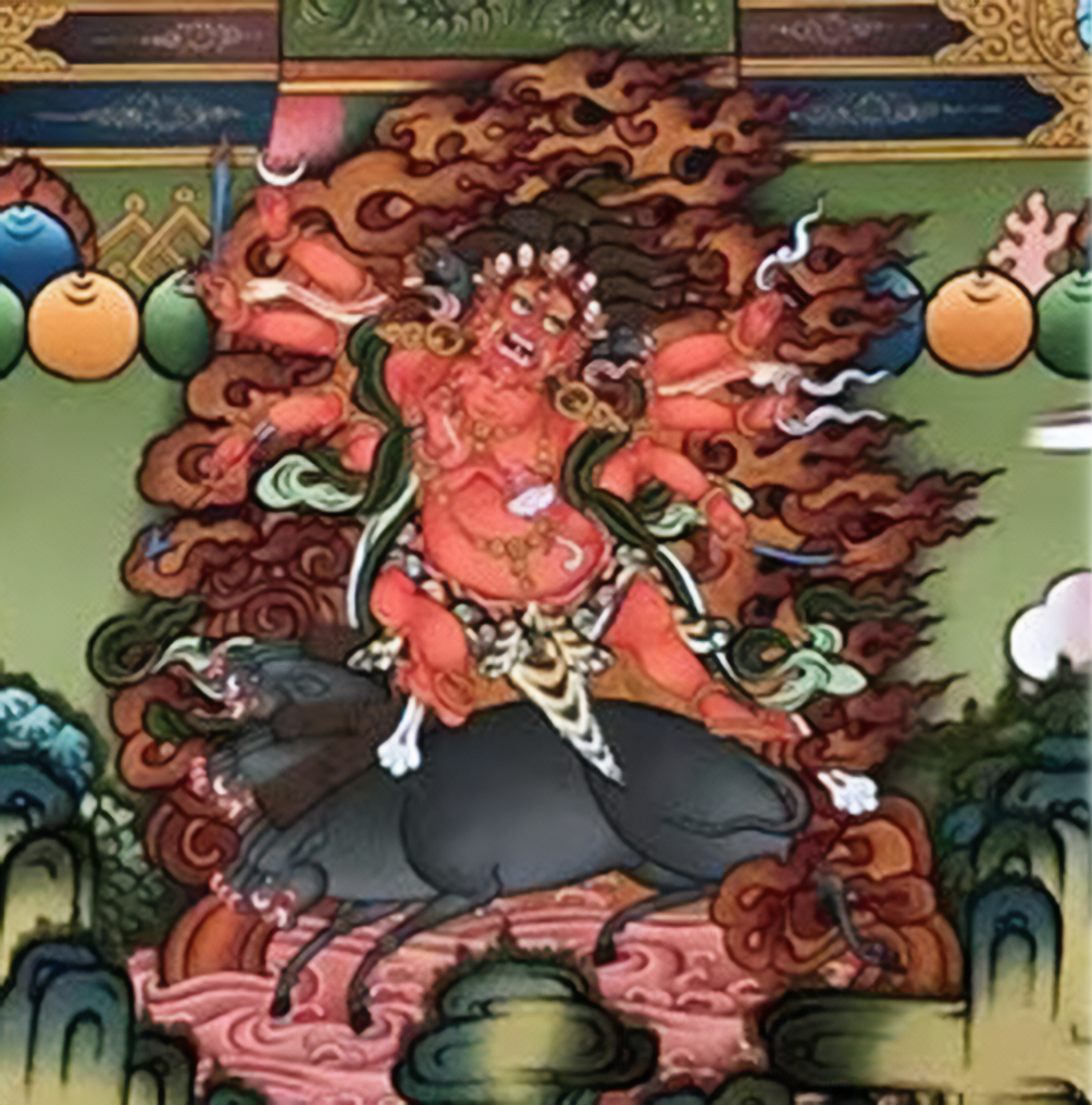Thus, every aspect in the iconography of Shenhla Wökar and other peaceful yidams of Yungdrung Bön such as the Four Chief Buddhas:[17] Jamma, Wisdom Goddess of Compassion and Loving-Kindness[18], Sangpo Bumthri,[19] and Tönpa Shenrab Miwo, are steeped in symbology. The Six Great Devourers we see around their thrones are not just ornaments; they are powerful creatures that protect us from all manner of demons.