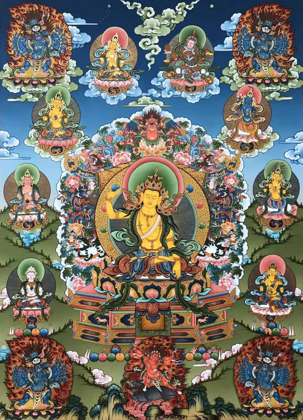 Shenhla Wökar[1] (see cover image above) is a peaceful manifestation, and like other emanations such as Jamma,[2] the features of his body, decorations and so on all hold special meaning. He displays the Nine Manners of Purity[3] and is adorned with the Thirteen Adornments of a peaceful sambhogakaya.[4]