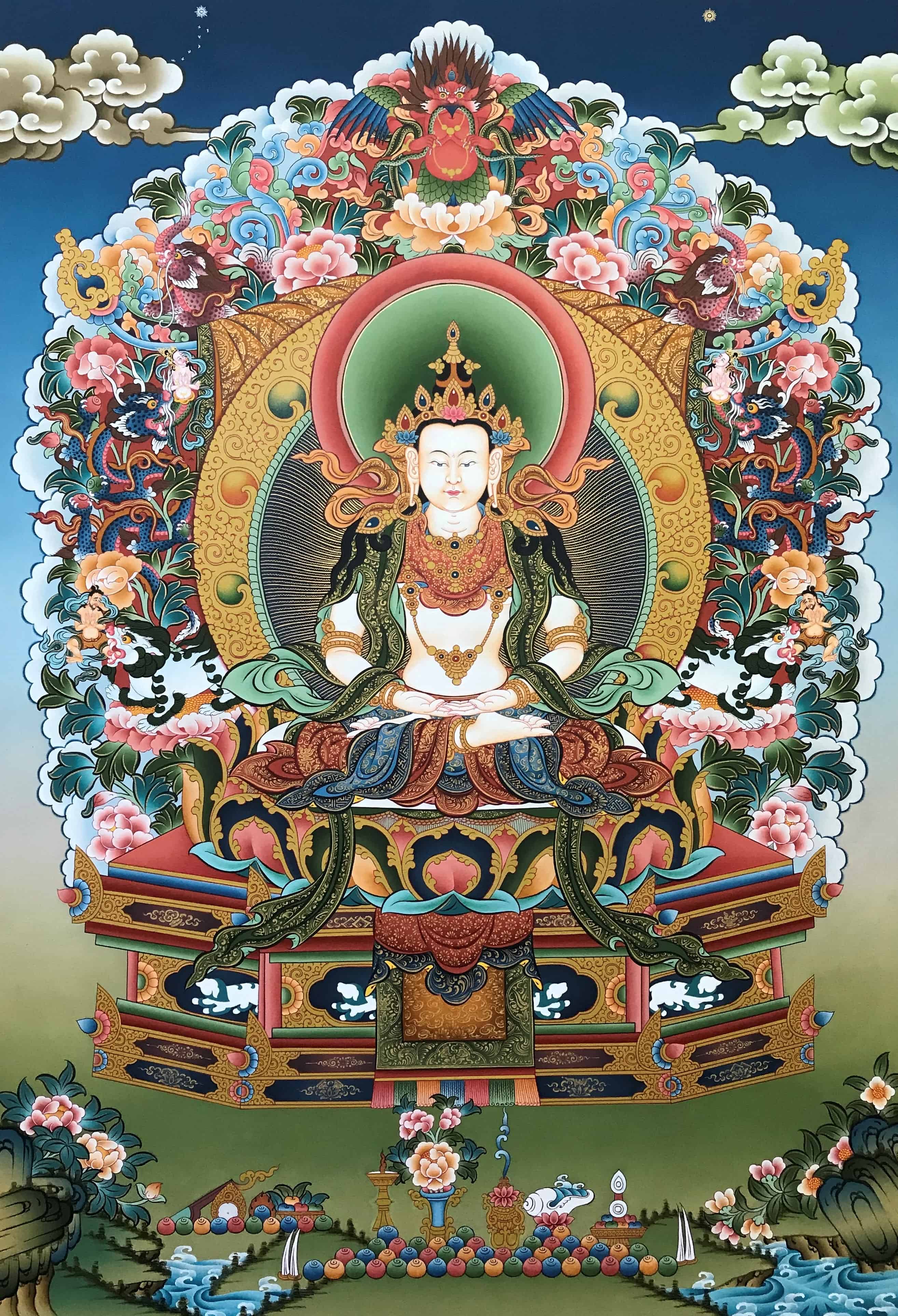 He sits on a throne supported by snow lions, which represents the subjugation and purification of anger.